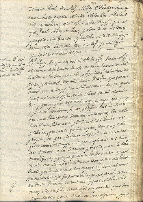 El rey. Por quanto vos, el reverendo in Christo, padre obispo de Cuenca, de el nuestro Consejo de Estado, inquisidor general contra la erética pravedad y apostasía, en los nuestros reynos y señoríos, nos a sido hecha relación que por no haver casas de inquisición en la ciudad de Cuenca en que se pueda ejercer el Santo Oficio de ella, se hace en casas alquiladas, y que ay gran necesidad de que las tenga propias, y que éstas se podrían hacer y edificar en el castillo que en la dicha ciudad mandaron derrocar los cathólicos reyes, don Fernando y doña Ysavel, mis visabuelos y señores, que santa gloria ayan, donde ay sitio y dispusición para se hacer, sin perjuicio de nadie por no servir de ninguna cosa.