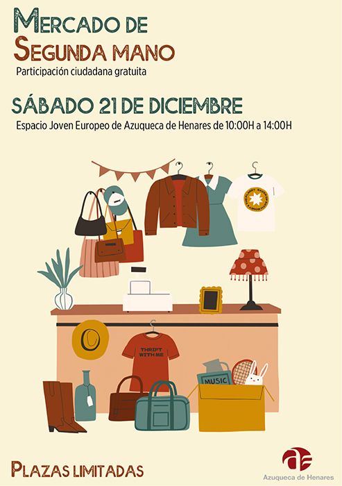 El Ayuntamiento de Azuqueca de Henares organiza el sábado 21 de diciembre un Mercadillo de Segunda Mano. La actividad se desarrollará entre las 10 y las 14 horas en el Espacio Joven Europeo (EJE). “Retomamos una iniciativa que ya se impulsó en Azuqueca con muy buena acogida precisamente, ahora, de cara a la Navidad, para fomentar un consumo responsable y la circularidad al dar una segunda vida a productos que todavía pueden aprovecharse”, explica el concejal de Desarrollo Sostenible, Rodrigo Vasco.