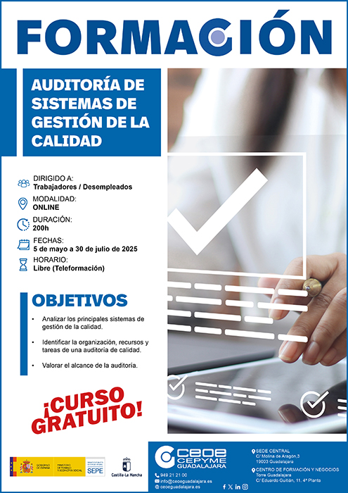 El departamento de Formación de CEOE-CEPYME Guadalajara ha abierto el plazo de inscripción para el curso gratuito de “Auditoría de sistemas de gestión de la calidad” dirigido tanto a trabajadores como a desempleados y que dará comienzo el próximo 5 de mayo y durará hasta el 30 de julio.