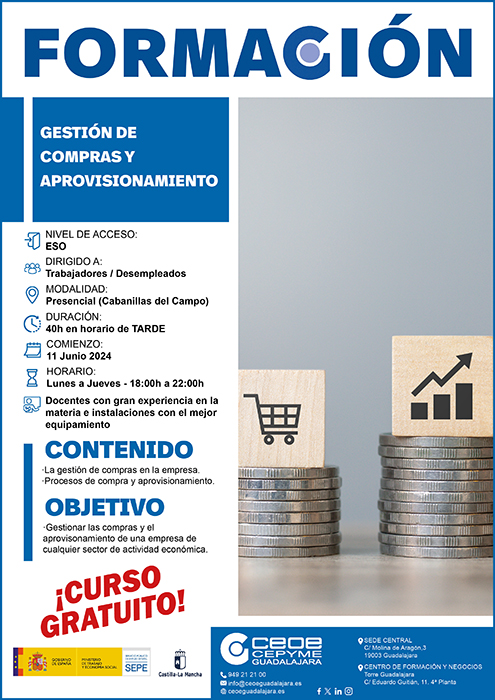 El departamento de Formación de CEOE-CEPYME Guadalajara está informando de la apertura de la inscripción para el curso gratuito de “Gestión de compras y aprovisionamientos”, que dará comienzo el próximo lunes 11 de junio y durará hasta el 26 de junio en la modalidad de presencial y que se desarrollará en Cabanillas del Campo, con horario de lunes a jueves de 18:00 a 22:00 HORAS.
