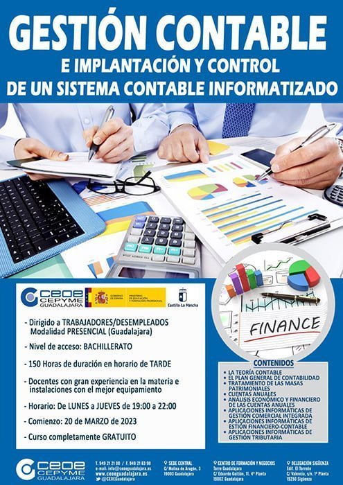 El departamento de Formación de CEOE-CEPYME Guadalajara informa de la apertura del plazo de inscripción para el curso de “Gestión contable e implantación y control de un sistema contable informatizado”, dirigido tanto a trabajadores como para desempleados con titulación académica de Bachillerato o superior, y que dará comienzo el próximo lunes 20 de marzo.