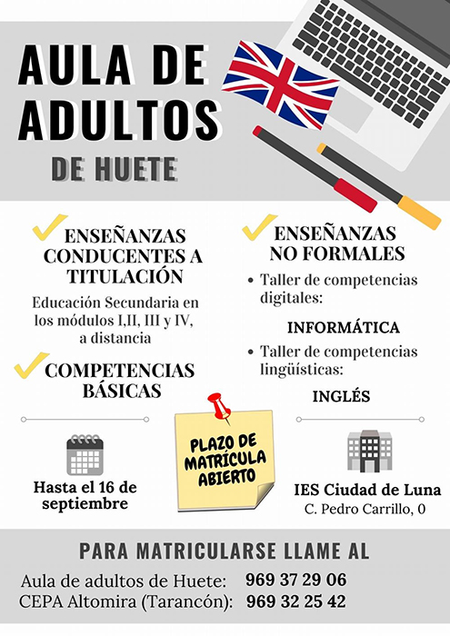 Ya está abierto el plazo de inscripción para la Escuela de Adultos de Huete, plazo abierto hasta el 16 de septiembre. Las inscripciones se realizarán en el Instituto de Educación Secundaria Ciudad de Luna de Huete, que será donde se impartan las clases o en el CEPA Altomira de Tarancón, teléfonos: 969372906 y 969322542 respectivamente.