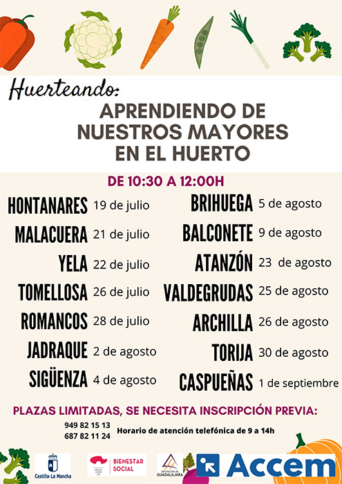Accem, desde los programas “Promoción de la Calidad de Vida y el Envejecimiento Activo en el Medio Rural” y “Envejecimiento Activo Accesible en el Medio Rural en la Provincia de Guadalajara” financiados por la Junta de Comunidades de Castilla La Mancha y la Diputación Provincial de Guadalajara, realizará durante este verano la actividad intergeneracional “Huerteando, aprendiendo de nuestros mayores en el huerto”.