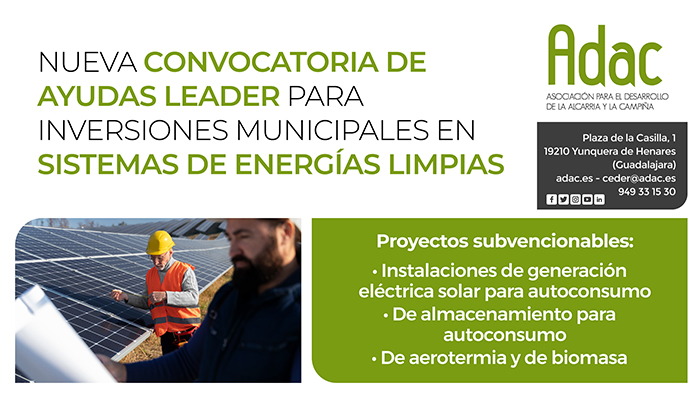 La Asociación para el Desarrollo de La Alcarria y La Campiña (ADAC) ha convocado nuevas ayudas LEADER por importe de casi 600.000 euros, destinada a inversiones municipales en infraestructuras de sistemas de generación de energía limpia para autoconsumo.