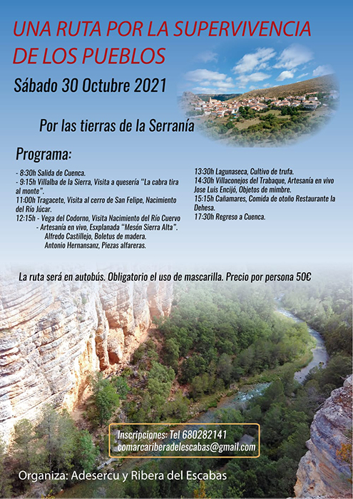Las entidades culturales Adesercu y Ribera del Escabas ponen en marcha este mes de octubre la iniciativa denominada »Rutas por la Supervivencia de los pueblos» con el propósito de poner en valor el abanico de recursos que forman parte del habitat natural del territorio para disfrutar de una realidad llena de encantos que con el tiempo se queda en el olvido..La primera ruta tendrá lugar el próximo sábado, 30 de octubre, por la Serranía Alta de Cuenca con visitas a las localidades de Villalba de la Sierra, Uña, Tragacete, Vega del Codorno, Lagunaseca y Cañamares, en todas ellas descubriendo la elaboración artesana del queso de cabra, degustando un plato de grato recuerdo como son las gachas de harina de almortas o incluso admirando el entorno del Cerro de San Felipe, en Tragacete, en donde nace el río Júcar.La ruta recalará en el paraje del Nacimiento del río Cuervo donde los participantes en esta experiencia presenciarán a los artesanos Alfredo Castillejo y Antonio Hernansanz haciendo boletus y níscalos de madera o piezas alfareras que a lo largo del tiempo han ocupado rincones hogareños o estanterías de diferentes espacios. En Lagunaseca y de la mano de los productores de trufas conocerán los cultivos de esta variedad tan codiciada por los mejores restauradores de la cocina española.. Y, en Cañamares, el programa de la ruta por la supervivencia de los pueblos, ha previsto la participación en una comida de otoño con un menú de níscalos con patatas y chuletas de cordero a la plancha, buen vino y postre artesano. El acompañamiento musical contará con sonidos de dulzaina y tamboril. Las personas interesadas en participar se pueden inscribir hasta el día 28 de octubre mediante el envío de un mensaje a comarcariberadelescabas@gmail. com, en el que figure el nombre y el teléfono.