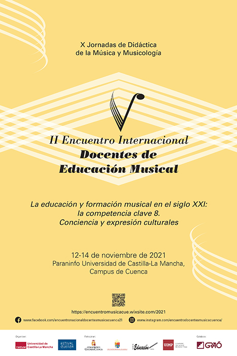 La Facultad de Educación de Cuenca (UCLM) albergará el viernes 12, sábado 13 y domingo 14 de noviembre de 2021 el II Encuentro Internacional de Docentes de Música de Cuenca/X Jornadas de Didáctica de la Música y Musicología. Este congreso forma parte del festival Estival Cuenca, más en concreto del apartado Estival Científico.