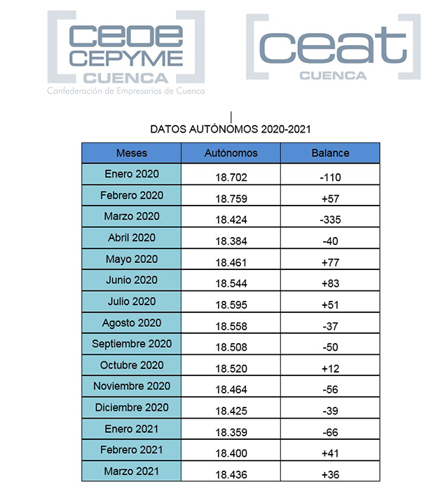 Asimismo, CEAT Cuenca quiere señalar que este incremento viene dado también porque en marzo del año pasado se redujeron los autónomos en 335 personas debido a la declaración del Estado de Alarma y ese hecho hace más asequible superar estos guarismos un año después.
