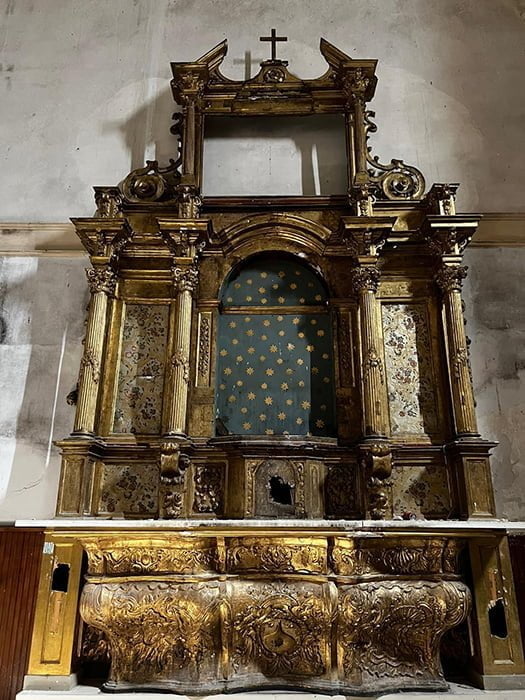 Muy destacable, dentro del cuerpo principal, es el exquisito guadamecí (cuero repujado y policromado) que cubre sus cuatro cajas. Singular técnica con contados ejemplos en arte sacro, que lo convierten en una muestra única en nuestra provincia. También interesantes los motivos decorativos alegóricos, con influencias orientales, que lo decoran.