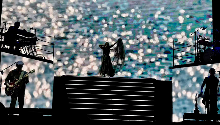 El escenario, cuidado al detalle, se transformaba con cada canción en un espectáculo cambiante y dinámico, lleno de proyecciones visuales. Sobre las pantallas destacaban imágenes del patrimonio natural, que dotaban al concierto de una dimensión poética y universal. La batería y el teclado se situaban en las alturas, visibles para todo el público, reforzando la sensación de monumentalidad.