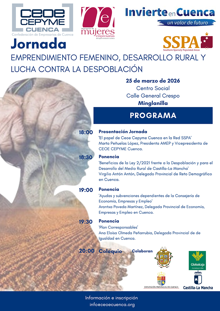 La jornada está organizada por la Asociación de Mujeres Empresarias, CEOE CEPYME Cuenca y la Asociación de Empresarios de Minglanilla (ASEMIN) con la implicación de los proyectos Invierte en Cuenca y la Red SSPA y sumando la colaboración de la Junta de Comunidades de Castilla-La Mancha, la Diputación Provincial de Cuenca, la Fundación Globalcaja y el Ayuntamiento de Minglanilla.