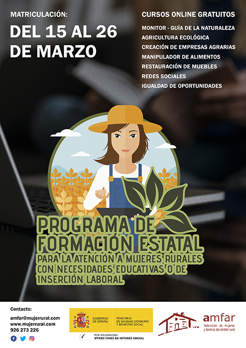 De este modo, hoy se abre el plazo de inscripción para siete cursos de formación online. Todas las mujeres interesadas podrán cumplimentar su matrícula hasta el día 26 de marzo a través de la página web de AMFAR: www.mujerrural.com o en la Plataforma de formación online creada por AMFAR, www.plazasenred.com.