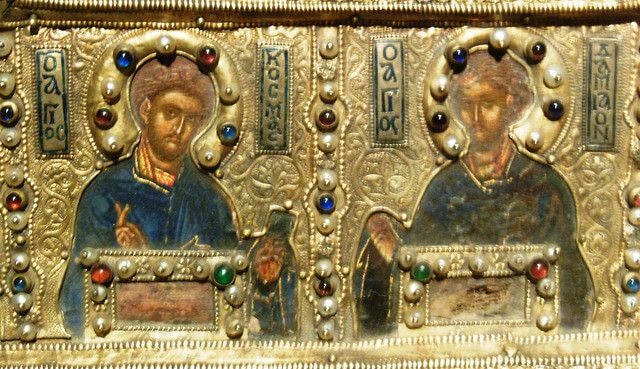 También conocido como el Relicario de los Déspotas de Epiro, el Díptico fue mandado realizar en el siglo XIV – probablemente entre los años 1.367 y 1.384 que fue el periodo de su regencia como soberanos – por los gobernantes del Despotado de Epiro en Ioánina, la basilisa María Angelina y su esposo el déspota Tomás Comneno. Obra encuadrada dentro de la denominada escuela cretense, con origen en las artes cultivadas en los conventos griegos del monte Athos, es un delicado ejemplo de encáustica (una técnica que emplea la cera como aglutinante para los pigmentos empleados) sobre tabla y plata repujada con perlas, piedras preciosas (se conservan un total de novecientas dieciocho perlas y trescientas tres piedras preciosas) y con, cual quedó dicho, reliquias.