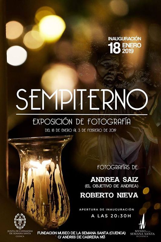 Los fotógrafos conquenses Andrea Sáiz y Roberto Nieva inauguran este viernes en el Museo de Semana Santa la exposición fotográfica Sempiterno, una colección de 22 fotografías en la que recogen detalles y momentos especiales de la Semana Santa de Cuenca, instantes que ambos artistas guardan en su recuerdo y que han querido compartir con el gran público. La inauguración tendrá lugar a partir de las 20:30 horas en la sala de exposiciones temporales del Museo.