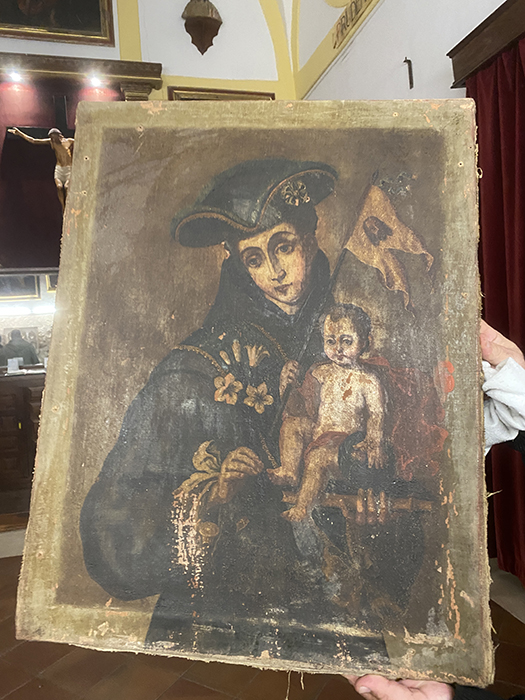 Esta pasada semana, realizando unas pequeñas obras de restauración en la hornacina del altar de la Virgen del Carmen, los operarios detectaron que la parte posterior de ella estaba formada por unos cristales pintados de color gris, al moverlos pudieron observar que algo se movió al otro lado. Retiraron los cristales, y entre éstos y el muro posterior, apareció un lienzo de San Antonio de Padua del siglo XVIII, que cumplirá ahora 300 años.