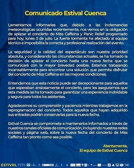 Debido a las inclemencias meteorológicas ocurridas recientemente, la organización de Estival Cuenca se ve en la obligación de aplazar el concierto de Miss Caffeina y Panic Relief programado para hoy, lunes 3 de julio. Una fuerte tormenta ha afectado al equipo técnico e imposibilita la correcta y profesional realización del evento.