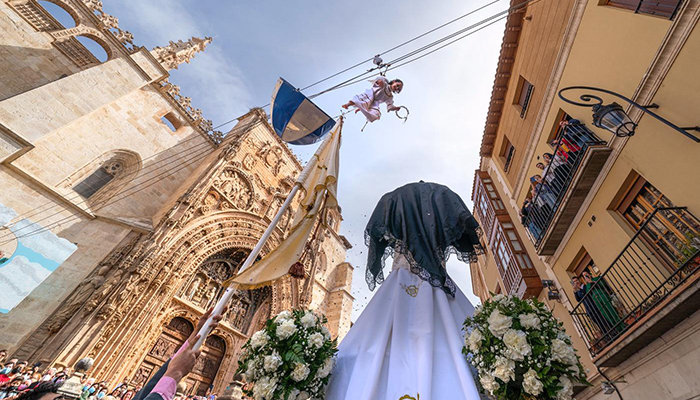 La Semana Santa de Aranda cuenta ya con el reconocimiento a nivel regional y tiene como acto más destacado y singular la tradicional Bajada del Ángel del Domingo de Resurrección. Una representación que se ha conservado en apenas tres localidades españolas, lo que le hace cobrar especial interés. En el caso de la capital ribereña, marca su personalidad la espectacular fachada de la Iglesia de Santa María, escenario del que desciende el Ángel, un niño o niña de entre tres y cinco años que será el encargado de anunciar la Resurrección de Jesucristo. El pequeño, deslizándose sobre una maroma colocada a unos siete metros de altura, se sitúa sobre la imagen de la Virgen, desciende hasta ella para quitarla el velo negro que cubre su rostro, contemplando enfrente la imagen de su hijo resucitado, una espectacular talla realizada hacia 1600. Diversos artículos sitúan el origen de la escenificación en la época medieval.