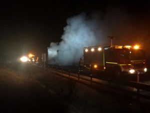 El camionero eslovaco, ayudado por otro compatriota, ha conseguido desenganchar la cabeza evitando que ésta se vea afectada. Toda la mercancía ha quedado totalmente destruida, al igual que el semirremolque.