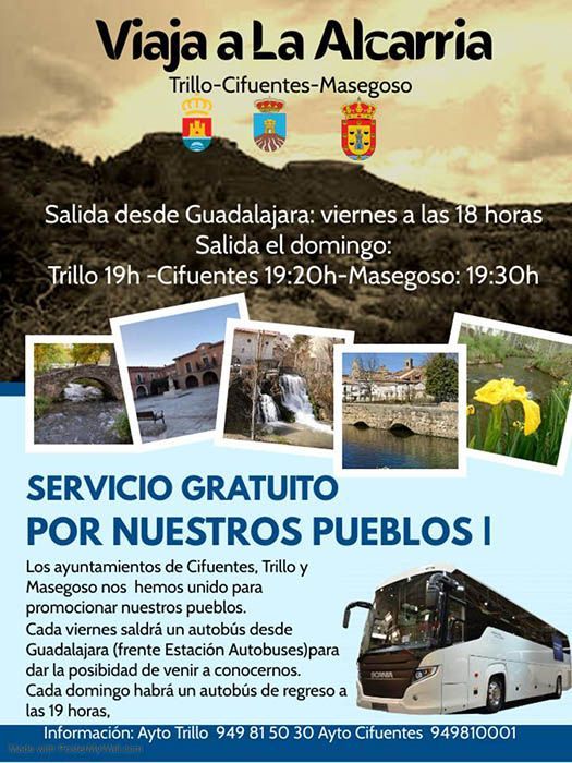 Hoy, viernes, comienza a funcionar el servicio de transporte gratuito habilitado gracias al acuerdo entre los Ayuntamientos de Cifuentes, Masegoso de Tajuña y Trillo. El objetivo de la iniciativa no es otro que cubrir el “insuficiente e ineficaz servicio regular de transporte actual” y fomentar el turismo hacia esta bonita zona de La Alcarria.