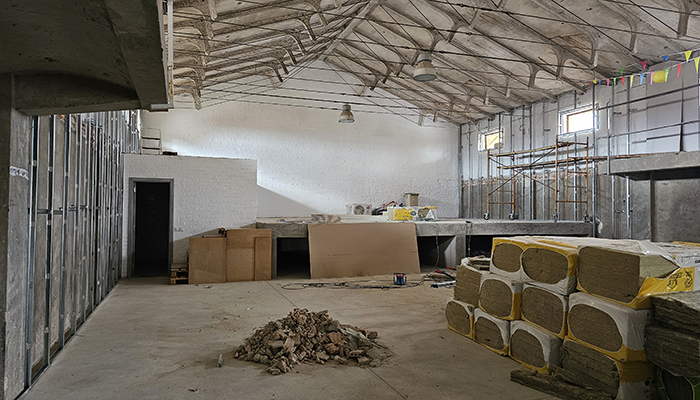 En esta ocasión los trabajos se están centrando en terminar el aislamiento térmico de las paredes y techo, equipar las instalaciones y rematar el conjunto final de las instalaciones. El resultado definitivo será un espacio de 1.150 m² formado por una zona de aparcamientos, un área exterior de descanso, un recibidor, baños accesibles, cocina-camerino, escenario y un salón principal con un aforo para 250 sillas.