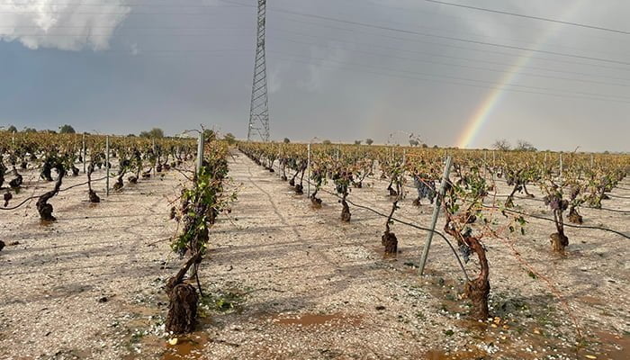 Precisamente, según datos recogidos por nuestra organización, entre Iniesta y Villagarcía del Llano ha quedado afectado entre un 70-80 por ciento de la viña. Algunos agricultores que se encuentran vendimiando por la zona señalan que en la mañana de hoy ha sido imposible acceder a las viñas debido al estado del terreno pero que se aprecian daños importantes “con numerosas viñas de bobal totalmente peladas por el granizo y el agua, tanto en Iniesta como en Castillejo de Iniesta”.