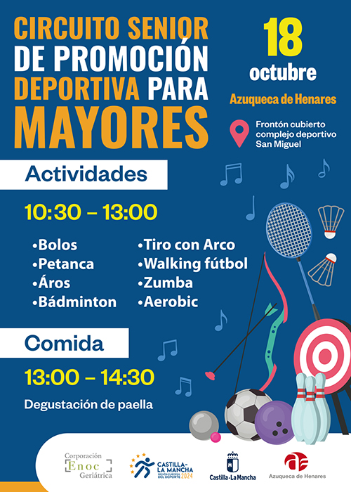 En el marco de las actividades organizadas por el gobierno regional con motivo de la designación de Castilla-La Mancha como Región Europea del Deporte, el viernes 18 de octubre llega a Azuqueca el «Circuito Sénior de promoción deportiva para mayores». Desde las 10:30 horas, en el frontón cubierto del complejo deportivo San Miguel, habrá actividades como bolos, petanca, baile, zumba, aerobic, yoga, aros, bádminton, tiro con arco y fútbol andando. Como cierre de la jornada, de 13 a 14:30 horas, se ha programado una degustación de paella. La concejala del área, Charo Martín, destaca que «es una buena oportunidad para realizar propuestas deportivas adaptadas a este colectivo y, al tiempo, disfrutar de la comida en compañía de otras vecinas y vecinos».