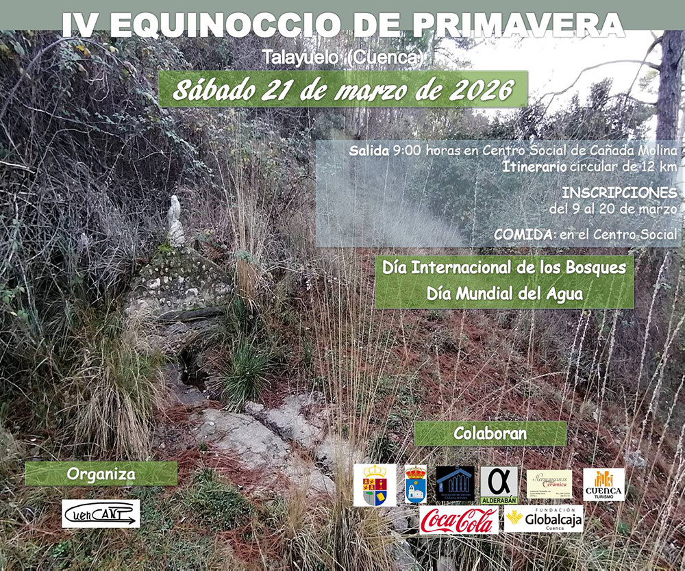 La Asociación Cultural CuenCANP organiza este sábado, 21 de marzo, su IV Equinoccio de Primavera con un recorrido circular de 12 kilómetros que partirá desde Cañada Molina. La actividad, abierta a todos los públicos, coincide con la celebración del IV Día Internacional de los Bosques y el VI Día Mundial del Agua, buscando conectar a los participantes con el entorno natural conquense durante el cambio de estación.