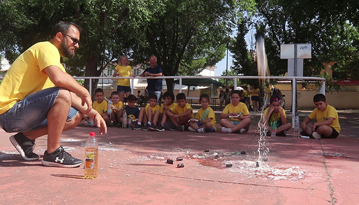 Desde las 10 de la mañana comenzó a media altura del parque un extraordinario taller infantil -“De Cabanillas al espacio: Los astronautas”- organizado por Los Forasteros, una peña muy familiar de la localidad, llena de parejas con hijos e hijas pequeños. En el taller pintaron un gran mural colaborativo, y sobre todo aprendieron a fabricar cohetes con botellas de plástico y química casera: proyectiles que se elevaban decenas de metros gracias a la reacción combinada bicarbonato y vinagre en su interior.