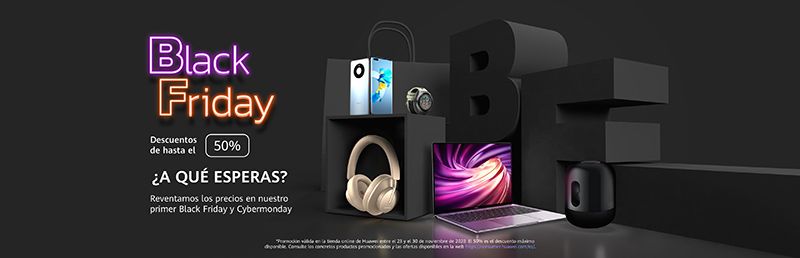 [1] Promoción válida en la tienda online de Huawei entre el 23 y el 30 de noviembre de 2020 con un descuento máximo disponible del 50%. Consultar los productos concretos en promoción y las ofertas disponibles en la web https://consumer.huawei.com/