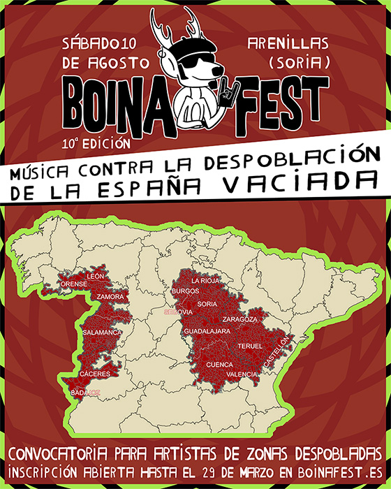 El plazo de inscripción permanecerá abierto hasta el próximo XX de marzo en boinafest.es/tocar y de entre todos los artistas inscritos, 3 serán los elegidos para compartir cartel con otros artistas aún por confirmarse. Ya que, además de visibilizar el problema de la despoblación y promocionar a artistas de dichas zonas, este singular festival sirve también de altavoz para artistas de zonas más pobladas, los cuales suelen tener más dificultades a la hora de girar en una provincia como Soria.