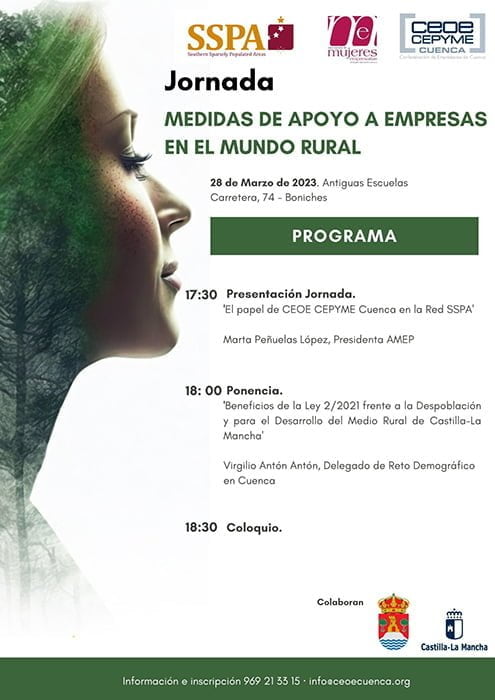 La jornada comenzará a las 17:30 horas con la intervención de Marta Peñuelas sobre ‘El papel de CEOE CEPYME Cuenca en la Red SSPA’, que además de señalar los trabajos realizados junto a las organizaciones de Soria y Teruel para luchar contra la despoblación también pondrán a disposición de las empresas presentes el trabajo del equipo técnico de la Confederación de Empresarios de Cuenca