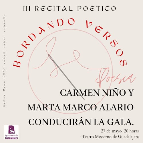 ‘Bordando versos’ trae este viernes al Teatro Moderno una gala de poesía y música con la participación de más una decena de artistasLa tercera edición de la actividad ‘Bordando versos’ llega este viernes al Teatro Moderno, a las 20:00 horas, con la participación de más de una decena de poetisas y poetas de Guadalajara y de otras provincias de España, como Madrid, Valladolid, Asturias y Jaén, para acercar la poesía a la ciudadanía.