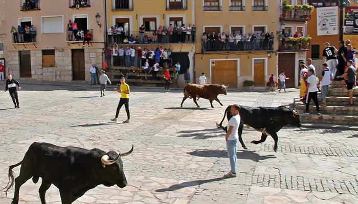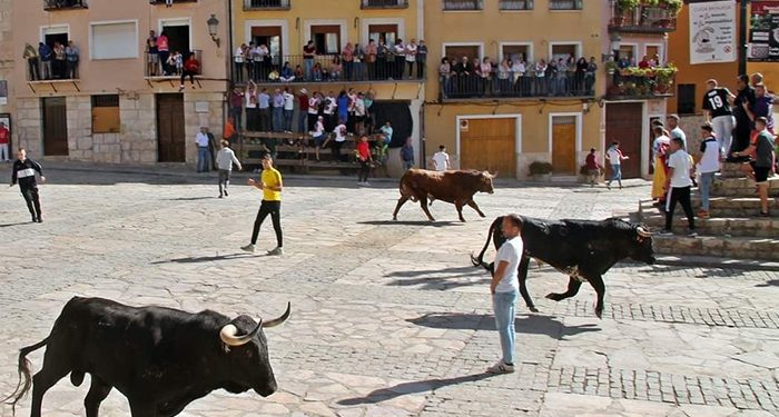 Y sin solución de continuidad llegamos las Ferias de Octubre o de San Rafael en la epoca que habia ganados, tres focos existien entonces, el llamado «Pozo Garron» donde se almacenaba la nieve en invierno para tener hielo en verano, aqui se centraban los gitanos con sus mulas, burros, esto es animales de raza caballar, en la «Picota» donde los mercaderes traian cerdos, obejas, etc., y donde se instalaban algunos puestos de baratijas y alguna tombola,y alhun carrusel para la chiquelleria, bien a lo largo de la carretera o en la Plaza de San Felipe o Plazuela de Herradores, antes de que hubiera toros por las calles, con el tiempo todo cambio, el campo cambio, las viviendas cambiaron y todo esto desaparecio, a la feria de ganados lo sustituyeron los toros, que tambien es otro ganado, aunque en lugar de haber sueltas de toros habia festivales taurinos en el Coso, a Brihuega han venido los hermanos Bienvenida, los hermanos Giron, (venezolanos) luego llego la moda de soltar los toros o vacas desde la calle de las Armas esquina a la de D. Justo Hernandez, hoy D. Camilo J. Cela hasta la Plaza del Coso parando por la hoy Calle Mayor, entonces Montes Jovellar, a Brihuega llegaban los vecinos de los pueblos proximos porque entre otras cosas tambien venian a mercadear. Hoy todo ha cambiado, la gente joven viene a divertirse y pasarlo bien en los bailes en la carpa y los pub.