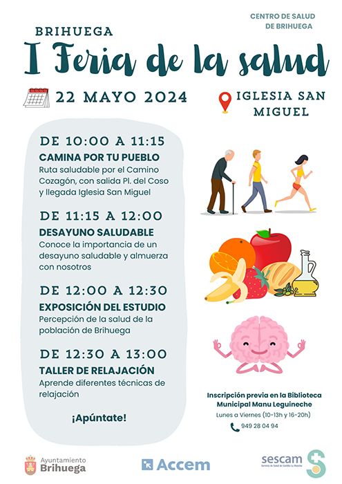 El próximo miércoles, 22 de mayo, los hábitos de vida saludable serán protagonistas en el Jardín de la Alcarria con la celebración de la I Feria de la Salud, organizada por el Centro de Salud de Brihuega, en colaboración con Accem y el Ayuntamiento. Primero con una ruta saludable por el camino de Cozagón, que se iniciará a las 10:00 en la Plaza del Coso y posteriormente con una charla sobre la importancia del desayuno.