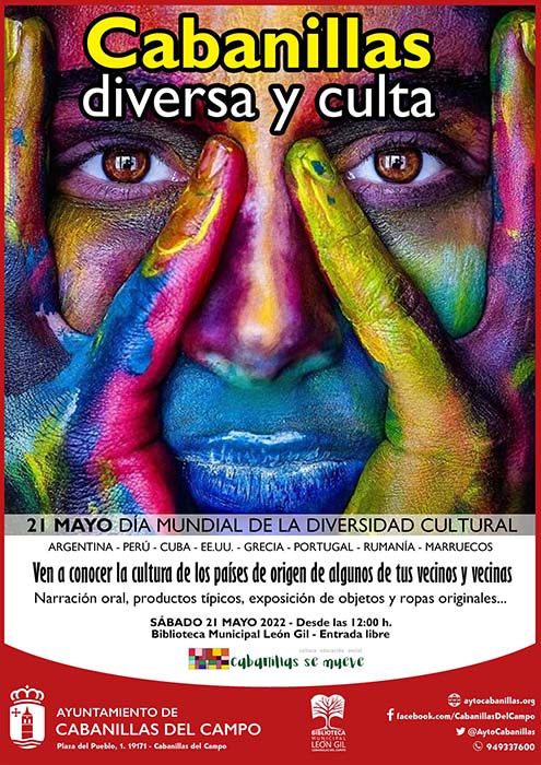 La Biblioteca Municipal León Gil de Cabanillas acoge el sábado 21 de mayo una jornada para conmemorar el «Día Mundial de la Diversidad Cultural», bajo el título «Cabanillas Diversa y Culta». Se trata de dar a conocer la cultura y modos de vida de diferentes países de origen de vecinos y vecinas que residen en nuestra localidad o que están vinculados de algún modo a Cabanillas, y que van a participar en esta iniciativa.