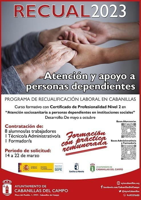 El Ayuntamiento de Cabanillas desarrollará entre los meses de mayo y octubre de 2023 una nueva edición del programa de recualificación laboral para personas desempleadas «Recual». Se trata de una iniciativa que se enmarca en las políticas municipales de fomento activo del empleo, y consiste en un taller de formación para el empleo con prácticas remuneradas, con el que se contratará a ocho personas como alumnos y alumnas trabajadores, además de a dos profesionales para conducirlo: un técnico o técnica administrativo, y un docente.