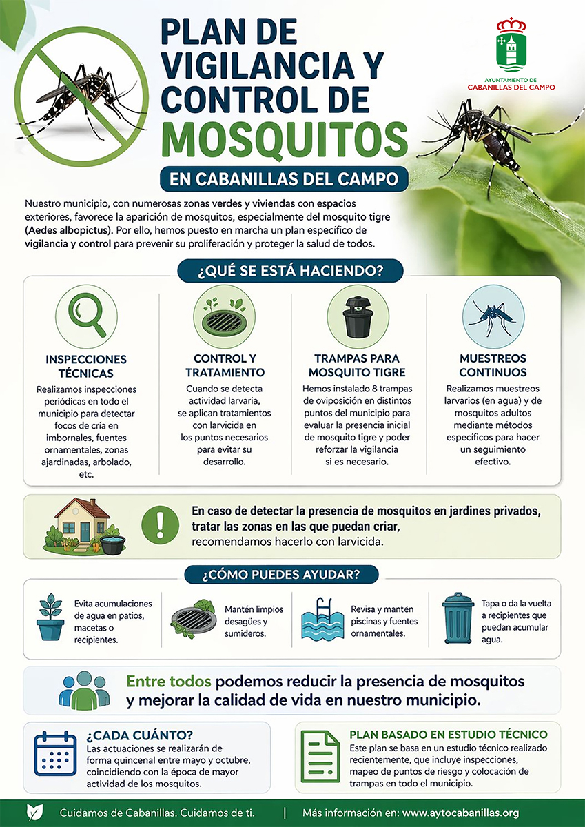 El Ayuntamiento de Cabanillas del Campo informa a los vecinos y vecinas de la puesta en marcha de un plan específico de vigilancia y control de mosquitos, con especial atención al mosquito tigre.