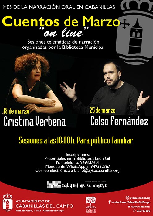 Como es tradicional en Cabanillas, la Concejalía de Cultura y la Biblioteca León Gil van a celebrar el Día Internacional de la Narración Oral, que se conmemora cada 20 de marzo. Y lo harán a través de dos sesiones de cuentacuentos, que este año se harán de modo telemático, por videoconferencia, debido a las restricciones sanitarias.