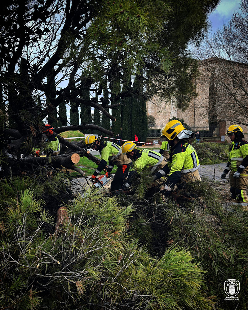 Los Bomberos del Ayuntamiento de Guadalajara han intervenido este sábado en la Plaza de España tras la caída de un pino de grandes dimensiones que, afortunadamente, no ha causado daños personales.