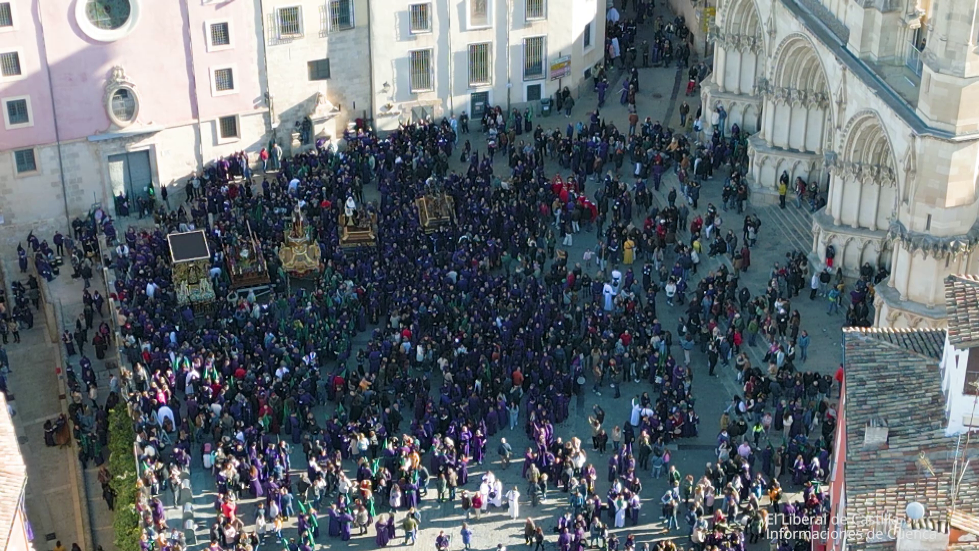 Comienza la Vía Dolorosa entre una turba que presencia la V estación en la que, el Cireneo, ayuda a llevar la cruz. Por detrás, la VI estación en la que, la Verónica, seca la cara a Jesucristo. Queda San Juan con su Evangelio en el que se lee que, por allí, estaba la Madre.