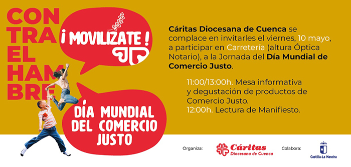 Bajo el lema “Le sienta bien a todo al mundo” Cuenca, se unirá a la celebración del Día Mundial del Comercio Justo el próximo viernes 10 de mayo, con varias actividades organizadas por Cáritas Diocesana de Cuenca y con la colaboración de la JCCM a través del Proyecto “Objetivo HambreCero, Movilízate”. Con esta jornada, las organizaciones de Comercio Justo alertan de las condiciones abusivas de trabajo, los precios ínfimos, la explotación infantil o el deterioro de la tierra que se esconden detrás de productos tan cotidianos como la ropa, el café o los artículos de cuidado personal. Ante ello, recuerdan a consumidores y consumidoras que los productos de Comercio Justo garantizan los derechos humanos y respetan el medioambiente. Por otro lado, ante la cercanía de las elecciones europeas, las organizaciones de Comercio Justo reivindican a los partidos candidatos al Parlamento Europeo una directiva ambiciosa que responsabilice a las empresas de sus impactos negativos en cualquier lugar del mundo donde se realice su producción.