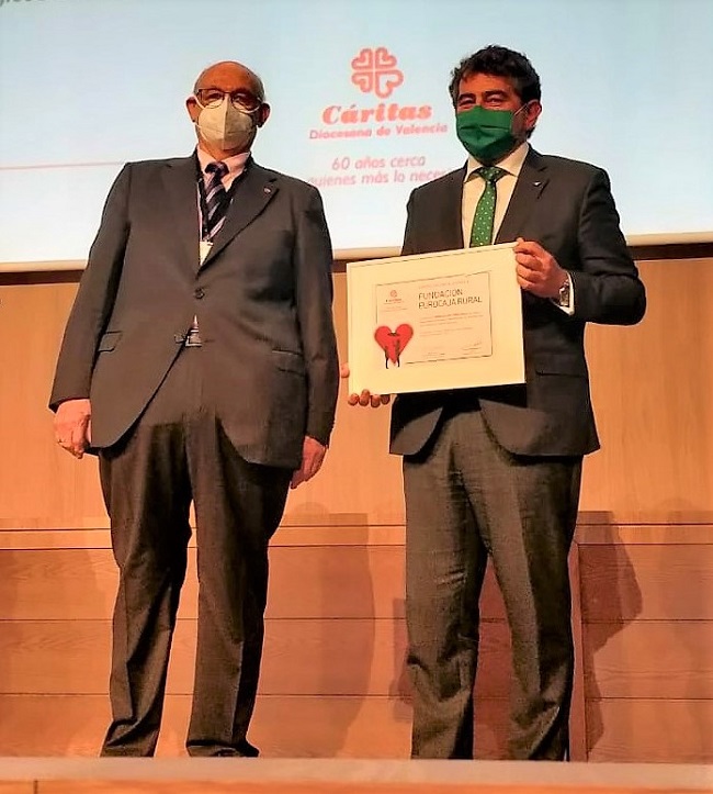 La Fundación Eurocaja Rural ha sido reconocida por la institución por el desarrollo de acciones de ‘Sensibilización y Sostenibilidad Financiera’ en la provincia, como la celebración de la ‘Carrera Virtual Solidaria’ en 2020, cuya recaudación en la zona le fue íntegramente donada. La organización sin ánimo de lucro destinó esta ayuda, fruto de la solidaridad de los que participaron en la misma, a garantizar y proteger los derechos fundamentales de las personas más vulnerables, como alimentación, empleo, educación, salud o vivienda.En el acto estuvo presente el Obispo Auxiliar de Valencia, Arturo Ros Murgadas, junto a todo el equipo directivo de Cáritas. La distinción concedida a la Fundación Eurocaja Rural fue recibida por el director de la División de Relaciones Institucionales de Eurocaja Rural, Miguel Ángel Escalante Pinel, que acudió al acto acompañado por el director territorial de la entidad financiera en Valencia, David Hervás Puig.