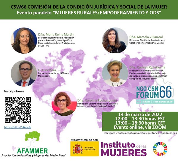 La Asociación de Familias y Mujeres del Medio Rural (AFAMMER), ha celebrado el side event MUJERES RURALES: EMPODERAMIENTO Y ODS en el marco de la 66 Comisión Social y Jurídica de la Mujer de Naciones Unidas, que es el principal órgano intergubernamental en materia de igualdad.
