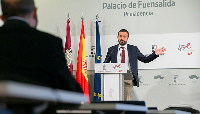 El consejero de Desarrollo Sostenible, José Luis Escudero, ha informado durante la rueda de prensa que ha llevado a cabo en el Palacio de Fuensalida de la aprobación de dos nuevos planes de empleo con los que el Gobierno de Castilla-La Mancha va a reforzar con 33 profesionales entre ingenieros, jurídicos y administrativos los equipos multidisciplinares que se encargan de gestionar expedientes de desarrollo sostenible y ayudas europeas procedentes de los fondos Next Generation, tanto en la Consejería como en sus delegaciones.