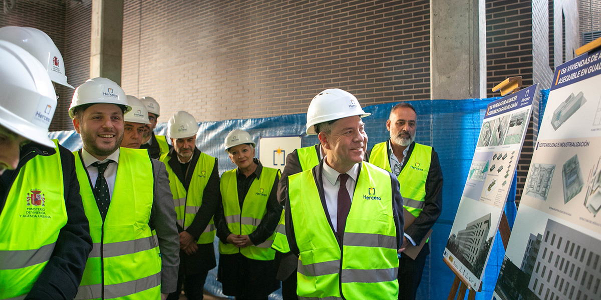 El presidente de Castilla-La Mancha, Emiliano García-Page, ha visitado las 156 viviendas que se están construyendo en Guadalajara, gracias al fondos ‘Next Generation’, junto con el consejero de Fomento, Nacho Hernando y la consejera de Igualdad, Sara Simón; la alcaldesa de Guadalajara; Ana Guarinos; y el CEO de Hercesa, empresa responsable del proyecto, Juan José Cercadillo.