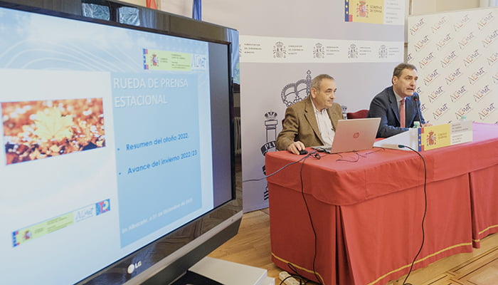 El delegado del Gobierno de España en Castilla-La Mancha, Francisco Tierraseca, y el director territorial de Aemet en Castilla-La Mancha, Marcelino Rojo, han informado, en rueda de prensa en la Subdelegación del Gobierno en Albacete, del resumen climático del otoño y la predicción de AEMET para los meses de invierno.