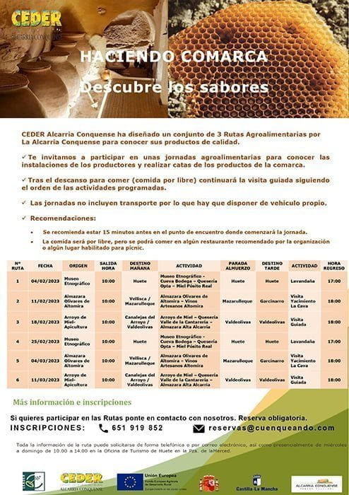 CEDER Alcarria Conquense oferta nuevas rutas guiadas gratuitas para descubrir los productos gastronómicos y patrimoniales de la comarcaLas primeras 6 rutas incluidas en ‘Haciendo comarca: descubre los sabores’ comenzaron el pasado 4 de febrero y finalizarán el 11 de marzo, consistiendo en una visita a las instalaciones de las empresas del sector agroalimentario con una cata del producto que elabora cada una de ellas. Los participantes podrán conocer el trabajo y degustar los caldos de la bodega Vinos Altomira en Mazarulleque, los quesos de Valle de la Cantarería en Canalejas del Arroyo y Opta en Huete, el aceite de las almazaras Olivares de Altomira en Vellisca y Alta Alcarria en Valdeolivas, la miel de Miel Pósito Real en Huete y de Arroyo de la Miel en Canalejas del Arroyo y los licores de lavanda de Lavandaña en Huete. Cada una de estas jornadas se completará con una visita guiada a un recurso patrimonial cercano a estas localidades como el yacimiento La Cava de Garcinarro, el núcleo urbano de Valdeolivas o los museos y monumentos de Huete.