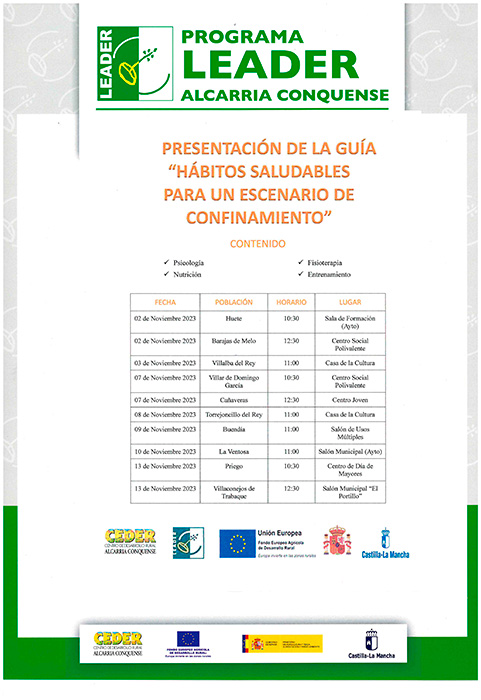 La Asociación CEDER Alcarria Conquense ha elaborado una guía, titulada ‘Hábitos saludables para un escenario de confinamiento’, donde se recogen pautas básicas para el cuidado de las personas ante una situación de confinamiento o aislamiento, la cual se va a presentar a lo largo de la primera quincena de noviembre en diez municipios de la comarca. Tanto la guía como las presentaciones de esta están financiadas a través de en la Medida 19 – LEADER – del Programa de Desarrollo Rural de Castilla-La Mancha 2014-2022.