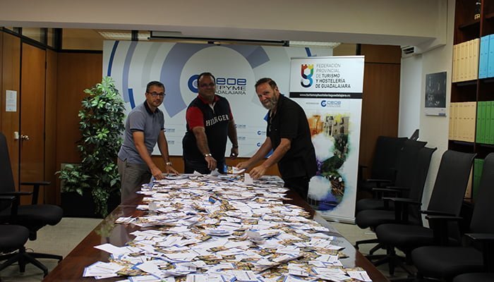 Juan Luis Pajares, presidente de la Federación provincial de Turismo y Hostelería de Guadalajara, integrada en CEOE-CEPYME Guadalajara, y Víctor Juan Morejón, concejal de Turismo del Ayuntamiento de Guadalajara, junto con Javier Arriola, secretario general de la Confederación de empresarios de Guadalajara, han sido los encargados de seleccionar las 75 papeletas ganadoras del segundo sorteo de la campaña Saborear Guadalajara y que da a sus titulares 60 euros para consumir en cualquiera de los cerca de 100 establecimientos participantes repartidos por toda la ciudad.