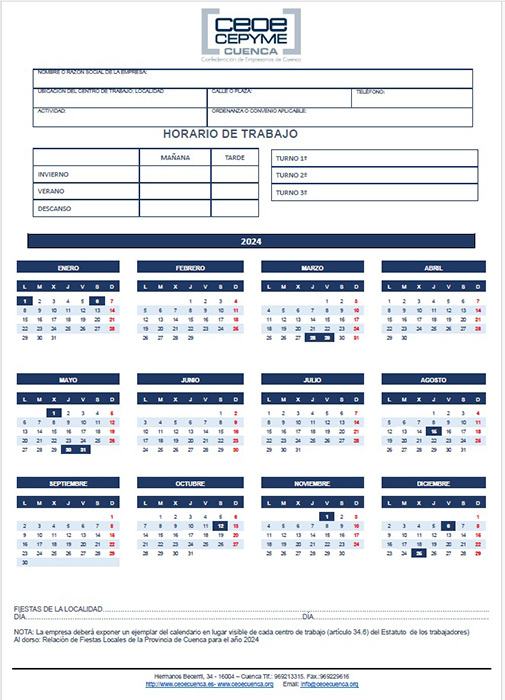 La Confederación de Empresarios de Cuenca, a través de su Departamento Jurídico, ha compartido el Calendario Laboral para el año 2024 con sus empresas asociadas.