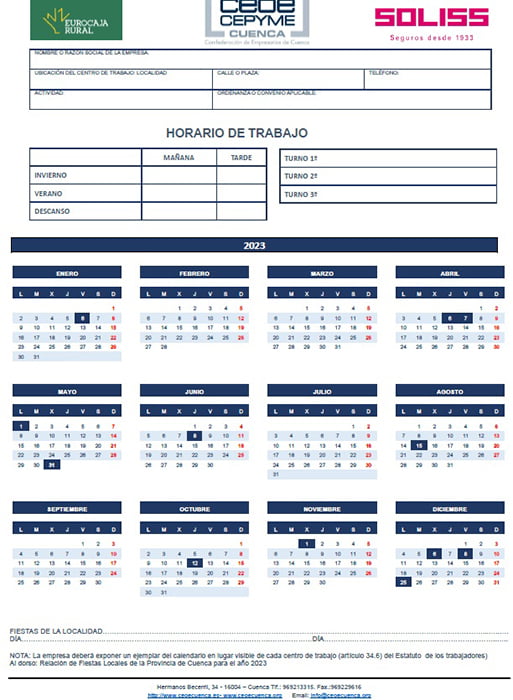 La Confederación de Empresarios de Cuenca, gracias a la colaboración de Eurocaja Rural y Seguros Soliss, ha realizado un modelo de calendario laboral que servirá a los asociados de la organización para conocer sus festivos y fijar sus jornadas.